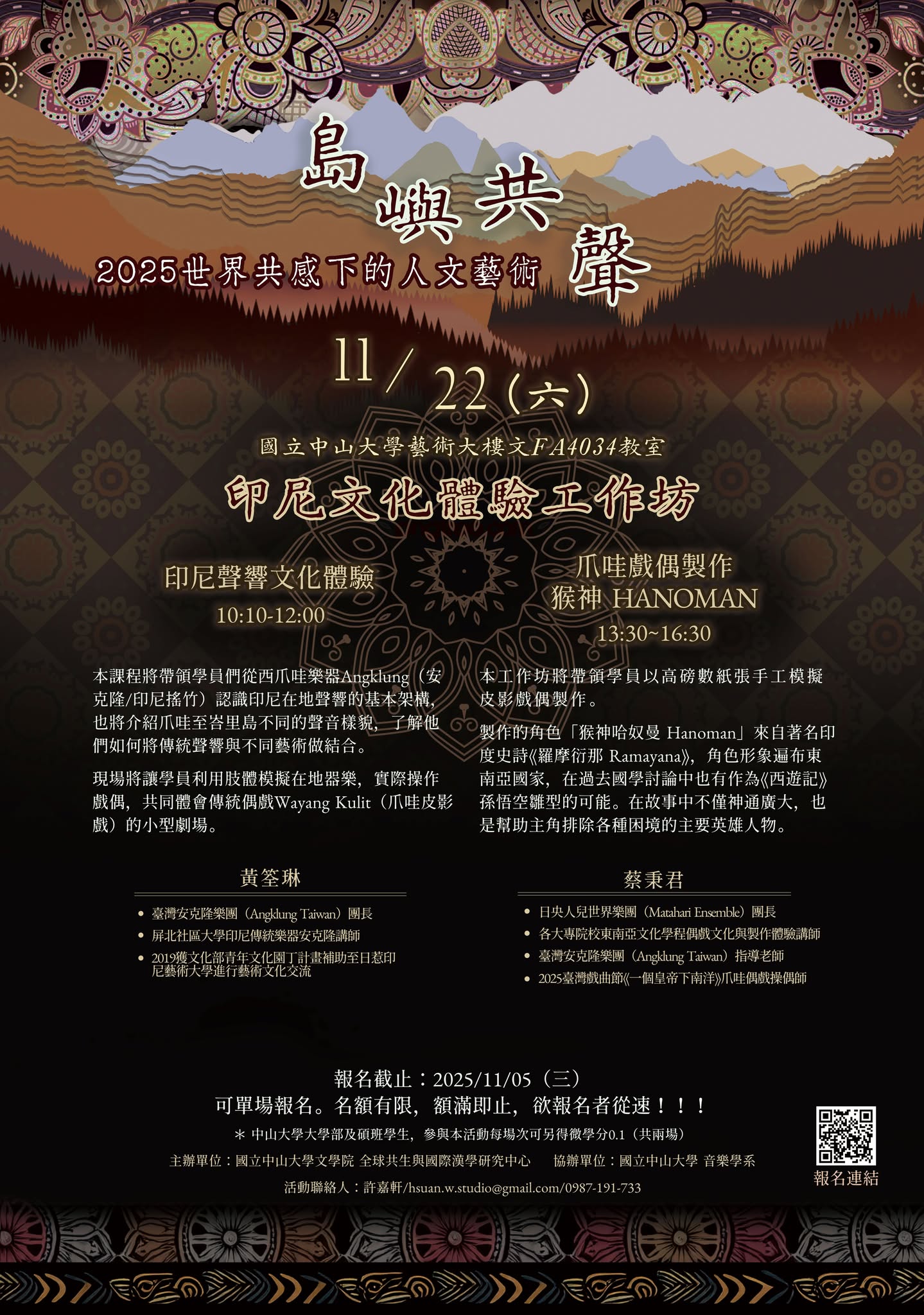 本工作坊分為「印尼聲響文化體驗」,以及「爪哇戲偶製作-猴神 HANOMAN」共兩堂,分別從器樂合奏以及戲偶手工製作活動,來認識印尼傳統戲曲中的聲響與故事等文化元素。